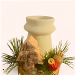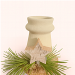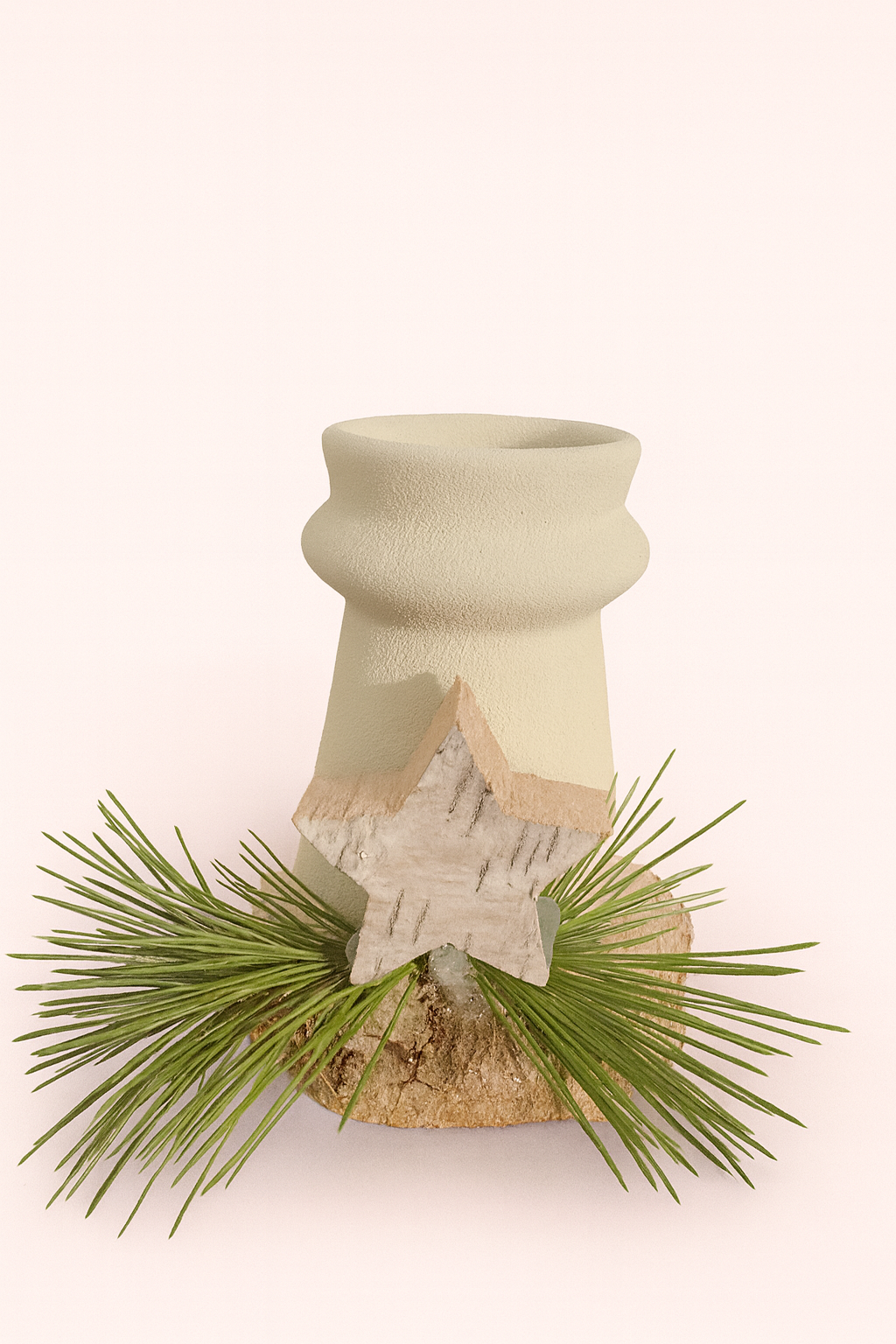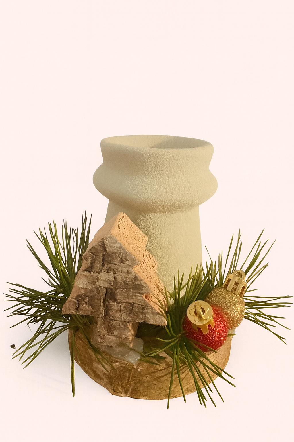 Ce charmant ensemble se compose d’un petit sapin ou étoile en bois sculpté, entouré de brindilles de pin vertes et de boules décoratives scintillantes, le tout posé sur un socle en bois.